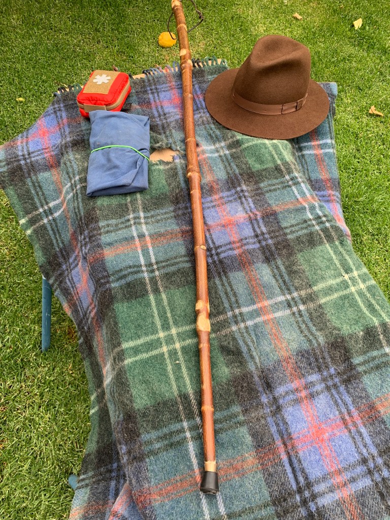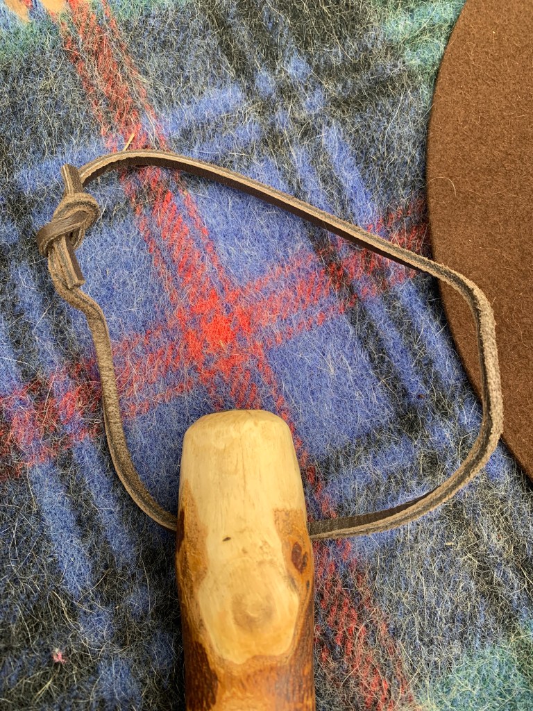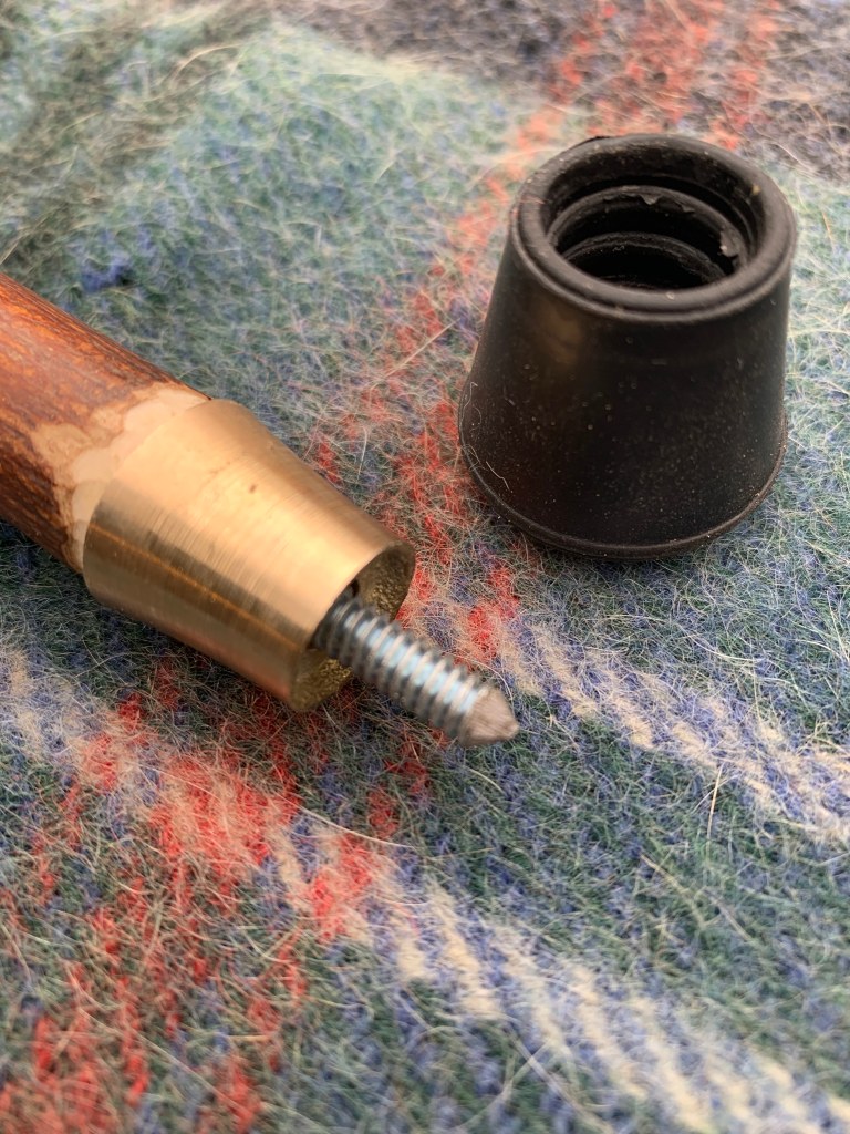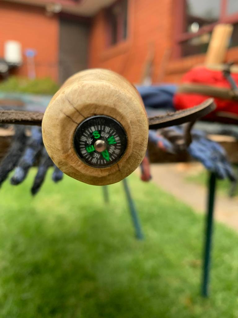Crafting of this stick began on 17 of feb 2021. The bark would remain intact for this stick and so I started handing at 240 and then 320 grit. The branch nodules were power sanded smooth. A 6mm hole was drilled for a lanyard, the tip was shaped for a cane tip and 3/16ths coupler that would receive a sharpened bolt. A rubber stopper covers this spike during paved path walking but when one goes off piste, the spike comes into its own. The handle was chamfered with an opinel 8 pocket knife and a 20mm hole was drilled at the top to secure a small button compass.The final sanding with wet dry paper, 800 then 1200 grit. The finish is 3 coats of Danish oil over 7 days with a light sand between coats, finally, a polish with Gilly’s Carnauba with a lambswool buff.