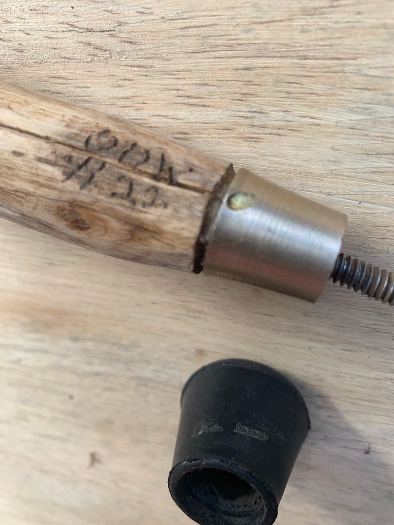 This was my first specimen of dealbata that I have crafted. Back at the workshop, I removed the bark dabbed PVA glue over both ends and put it away for curing. On the 15th of March 2021 I began the crafting work. Acacia naturally splits, and this piece was no exception, but it was not bad enough to consign to the firewood stack. No requirement for steam bending. Filled the cracks with Timbermate Blackwood Filler then sanded to 100 grit. The Handle was chamfered with a drawknife and a pocket knife. A 6mm hole was drilled for a leather lanyard. The tip was shaped for a brass cane tip and a 3/16th zinc coupler was fitted inside to harbour a 3/16th tapered bolt. The stick was then hand sanded through the grits from 120 to 600. The serial number was engraved at the foot of the stick. A final sanding of wet and dry from 800 to 1200. The stick was then finished with 1 coat of Sikkens exterior satin base coat walnut. A polish with a homebrew Yilang Yilang mix buffed with lambswool.